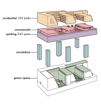 The design of the student residence in downtown Sudbury incorporates building integrated agriculture in order to establish a local food source within a northern city. The main concept focused on the accessibility of healthy food for students versus fast food by providing easy access to healthy food options, improving students health and well being.
